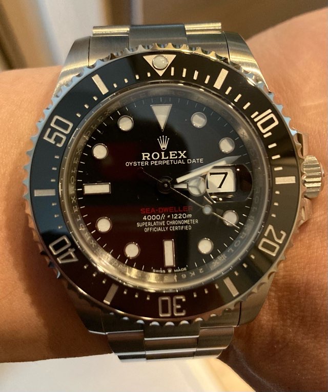 꽉찬 베젤, 개편한 시계줄 조정 글라이드록, 시계 페이스에 써있는 빨간색 씨드웰러